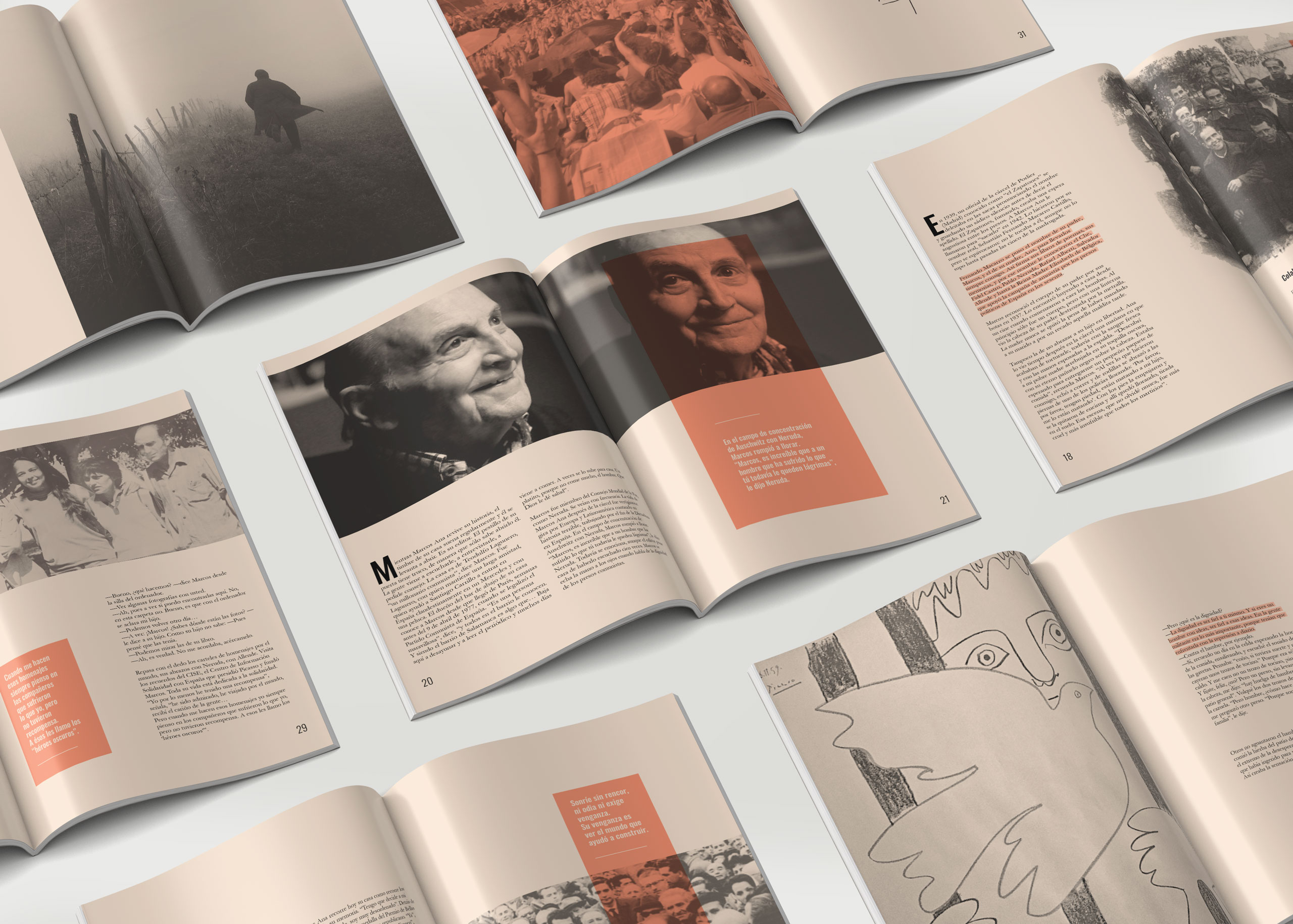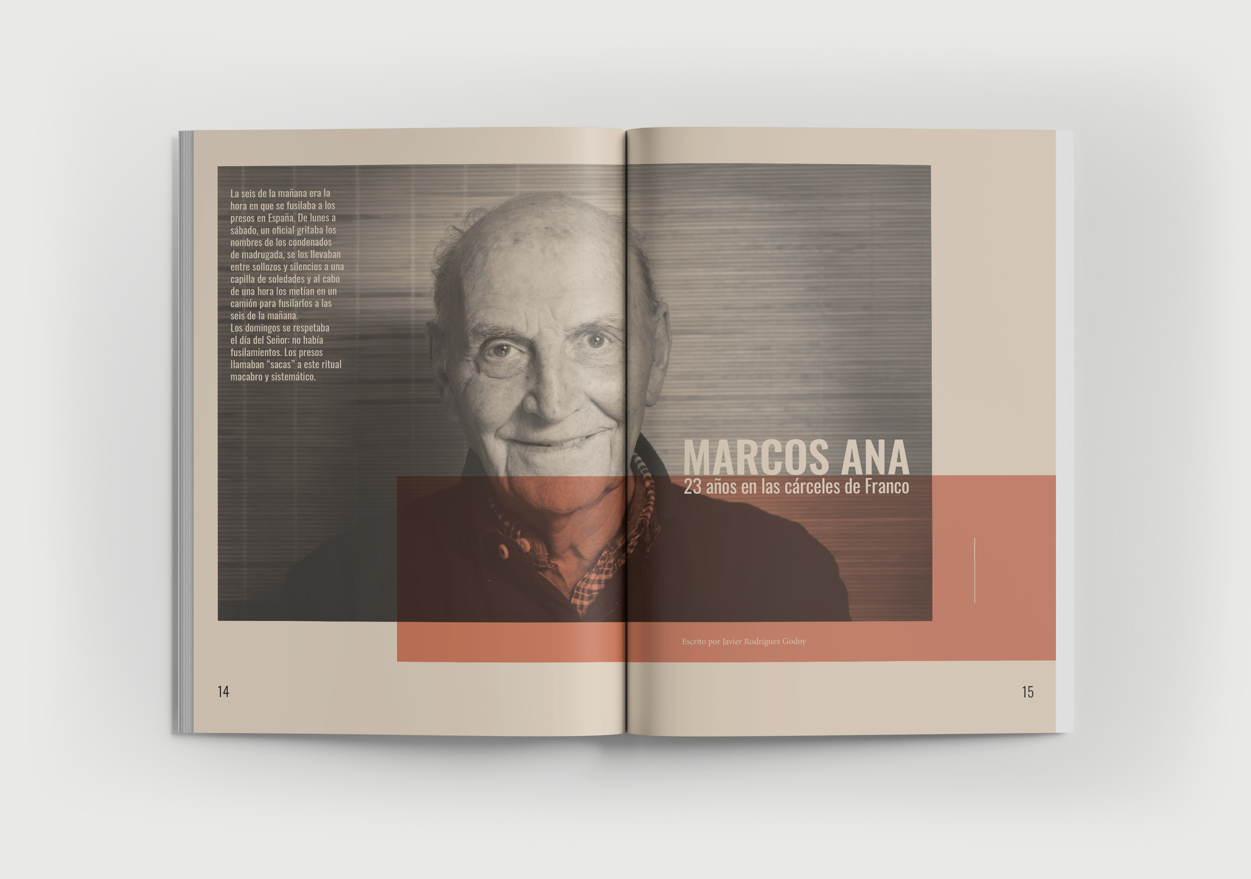 Maquetación de un artículo dedicado a Marcos Ana, poeta, militante comunista y la persona que más tiempo pasó en una cárcel franquista: 23 años de prisión, desde los 19 hasta los 42, marcados por torturas, represalias y resistencia. Tras su liberación gracias a la recién fundada Amnistía Internacional, siguió escribiendo, militando y defendiendo la libertad hasta su muerte en 2016.